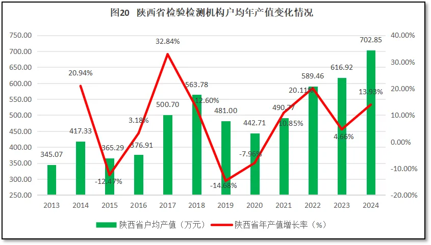 由图20可见,陕西省检验检测机构户均年产值呈现一个波浪式增长的发展特点,分别在2014年、2018年出现两次峰值,之后就开始下跌。不过,从2020年以来,陕西省检验检测机构户均年产值逐年增长,暂未出现下跌的现象,2024年度为702.85万元,是2013年的2.04倍。从增长率的曲线来看,除了头两年数据误差大显得增长率很高之外,陕西省在2017年和2022年出现两次增长率高峰,增幅分别达到32.84%和20.11%,2024年度的反弹幅度也有13.93%。