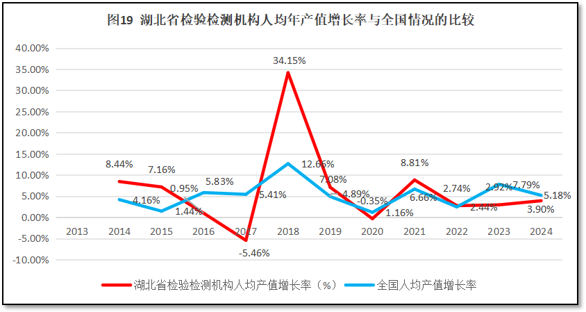 再来看湖北省检验检测机构人均年产值增长率与全国人均年产值增长率的比较,如图19所示。